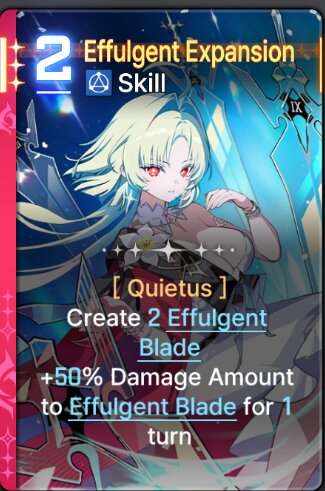 ![]() | [Quietus] Create 2 Effulgent Blade. +50% Damage Amount to Effulgent Blade for 1 turn. | |||
