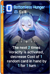 When Voracity is activated 3 times in 1 turn, decrease Cost of 1 random card in hand by 1 until used (1 time per turn)