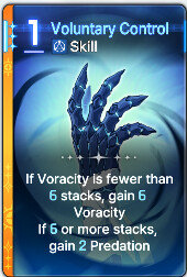Voluntary ControlA good Narja card that provides Narja with both of her important stack effects: Voracity and Predation. Can be duplicated when obtaining the correct Epiphany.