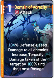 Domain of VoracityNarja’s AoE attack card and her main debuff card to work alongside Sereniel in the Ravage team. Can be duplicated if players want to build sub DPS Narja.