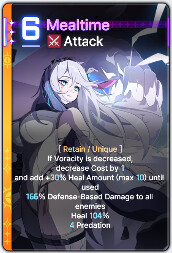 Predation is Narja’s other important gimmick, which can also be gained by fulfilling different conditions when using her cards. When Narja has Predation, whenever she consumes Voracity, she will further boost the damage output of the attack cards used by a massive amount.