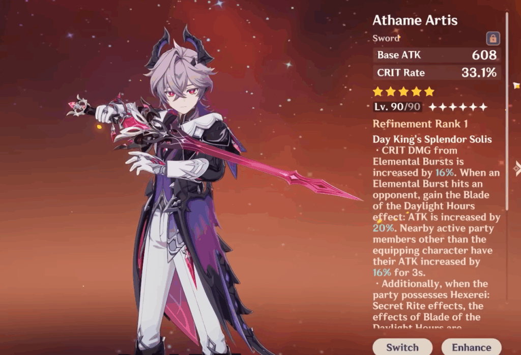 | S+ | Athame Artis | 608 | CRIT Rate33.1% | After Burst provide 16% CRIT DMG and 20% ATK. when the Hexerei: Secret Rite effects the effects of Blade of the Daylight Hours are increased by an additional 75% |