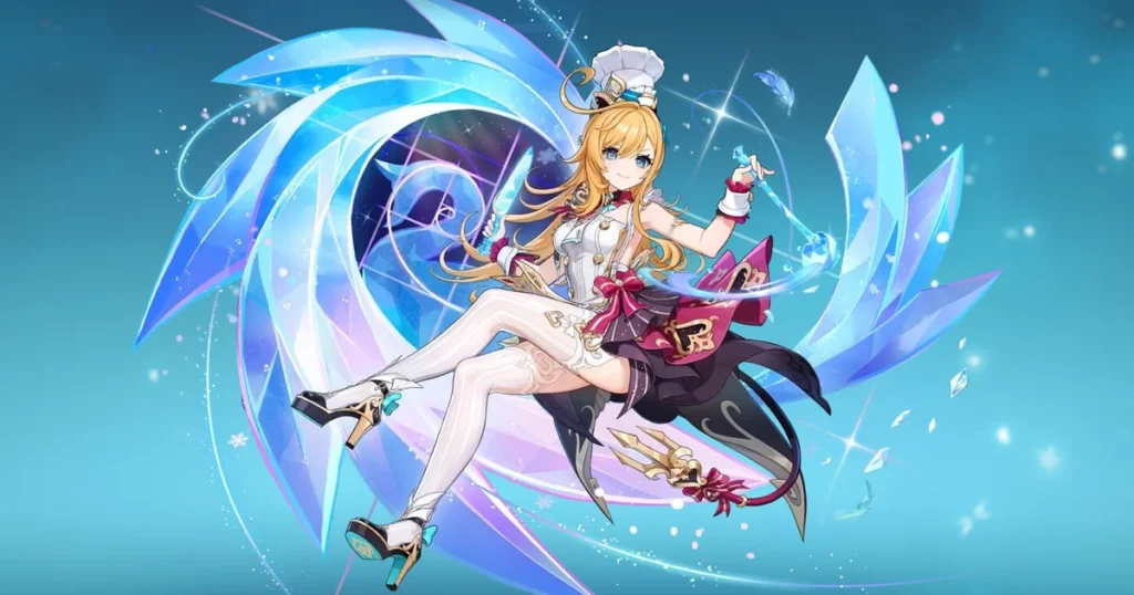 Genshin Impact Escoffier arrives with exclusive Cryo/Hydro Support and dominant Frozen reaction support capabilities when she debuted in Version 5.6. As a renowned chef from the Hotel Debord in Fontaine, she steps into Teyvat with the elegant charm of dessert dishes. And she also brings huge enhancement for The Hydro/Cryo teams that she can reduce Hydro/Cryo RES.