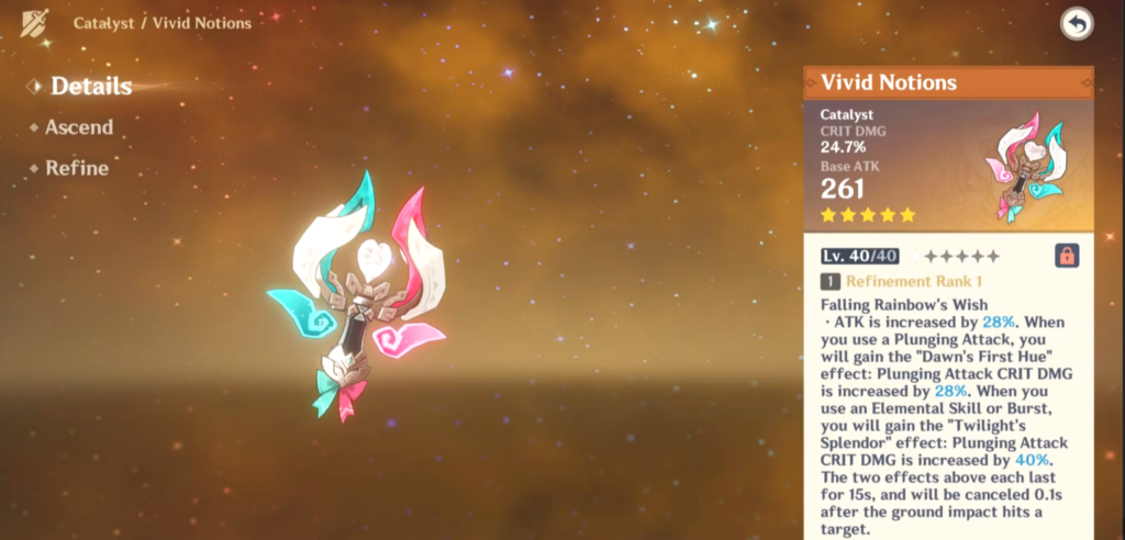 | S+ | Vivid Notions | 674 | CRIT DMG 44.1% | High ATK Bonus and specially plunging CRIT DMG+ |