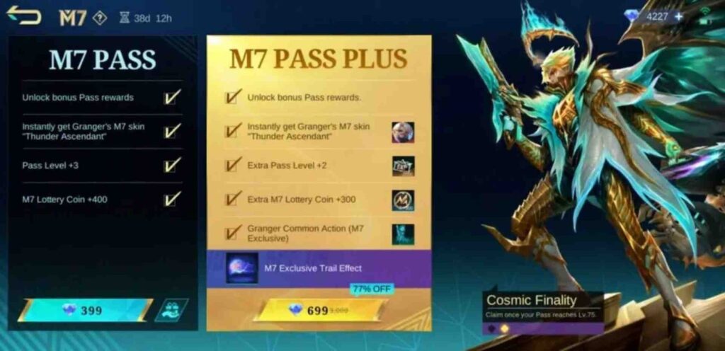 The M7 Pass (Jan 1 – Feb 8) is the month’s centerpiece, themed around the M7 World Championship. It costs: 399 Diamonds (base), 699 (Plus) and the free track hits Lvl 75 for Gatotkaca “Solar Spark”.
