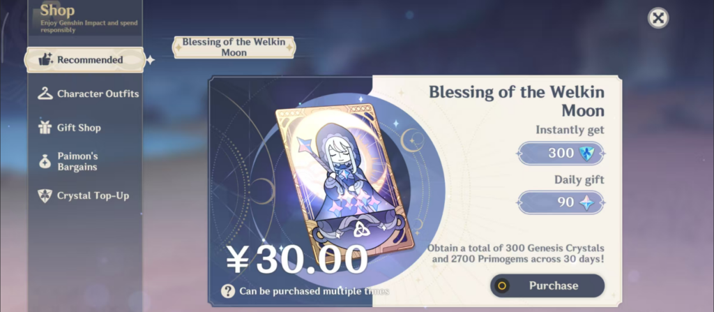 | Welkin Moon | 90 Primogems Per Day with 42 Days of Version 6.3 In total 3780 Primogems |
