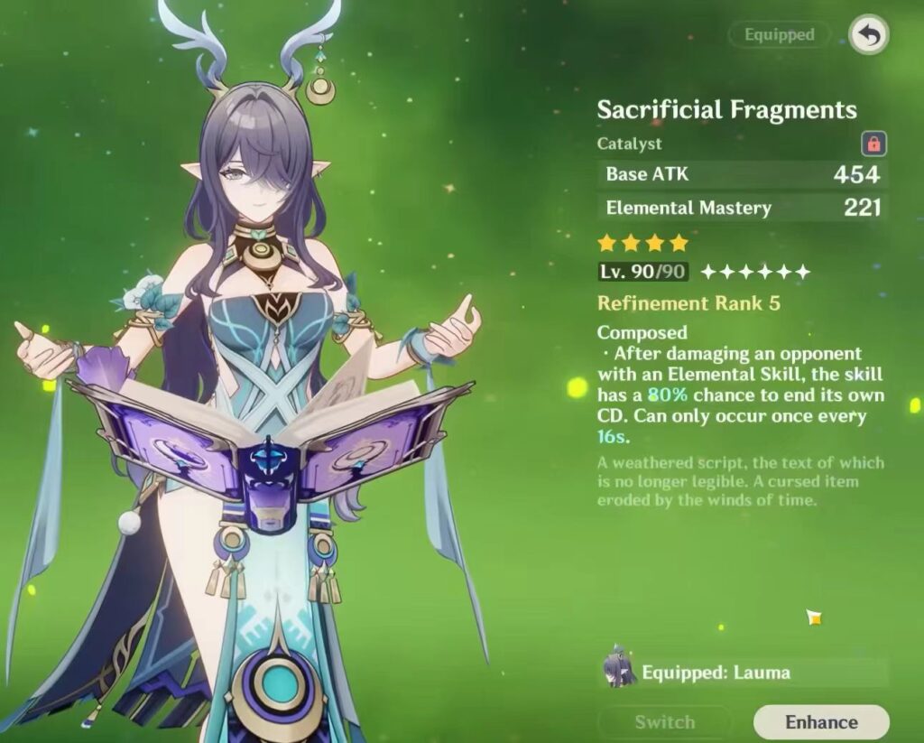 To start the rotation with Lauma’s NA or Skill to apply Dendro. Usually use NA except for using Skill while equip Sacrificial Fragments.