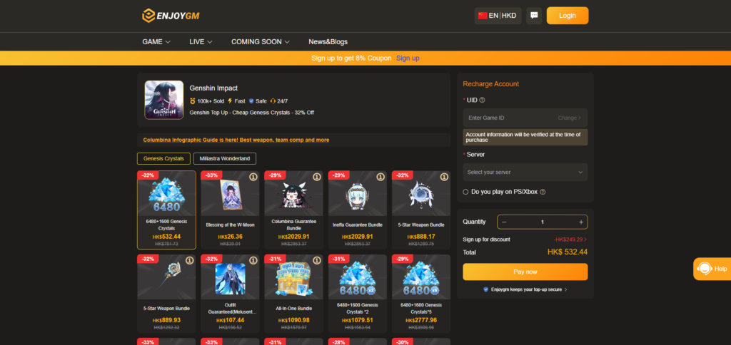 In Version 6.3 Phase 2, this outstanding Hydro Main DPS will have his rerun banner. We suggest you to pull Neuvillette with his massive power of Main DPS. And here a reliable platform to top up Genesis Crystals – Enjoygm is all you need!