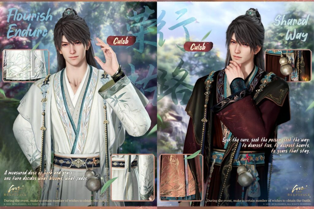This collection reimagines each male lead through modernized Chinese traditional couture: it anchors each design in classic robe silhouettes, then layers character-specific motifs (bamboo, scales, swords, etc.) and color contrasts to mirror their personalities—marrying ancient elegance with romantic, character-driven flair. The result is a cohesive yet distinct lineup that blends cultural richness with the game’s fantasy-romance tone.