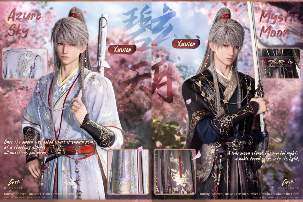 Xavier’s sword-immortal outfits mix pale blue swallow-stitched silk and black-gold moon motifs. A sword complements the design, fusing warrior coolness with noble dignity.