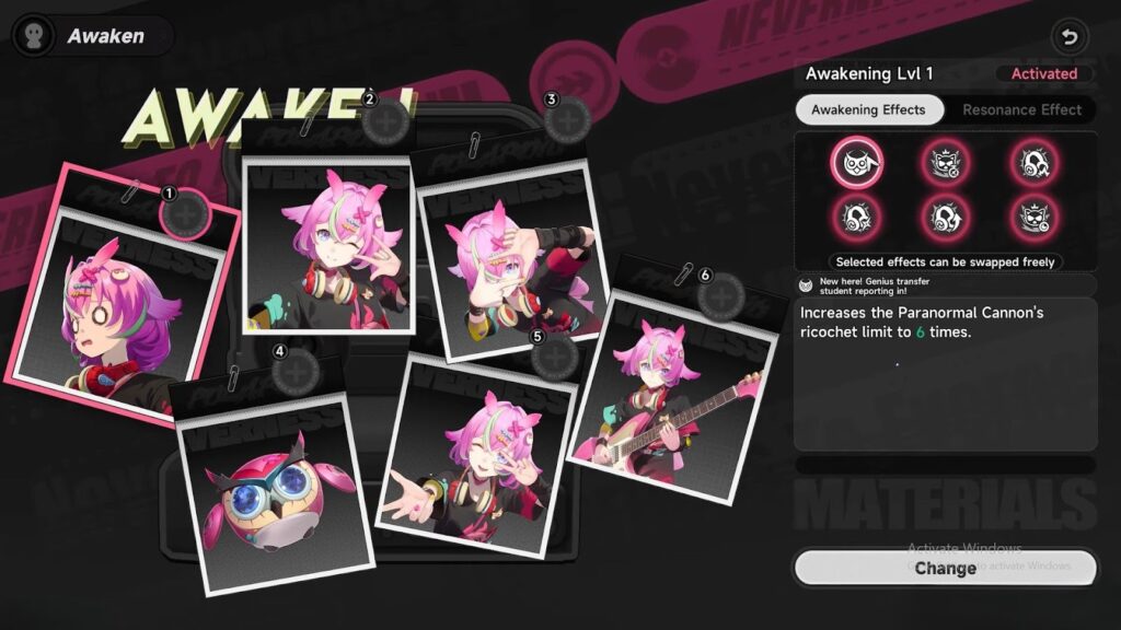 - Ultimate: A Melody Named Haniel — “Genesse Girls’ Academy Paranormal Department! Assuming control!” Releases a team-wide enhancement field and enters Paranormal Ace state. Grants ATK bonus to the whole team. Ensemble triggers also create a stronger Ensemble – Symphony effect with bigger DMG and range. While in Ace state, Hootie’s timer pauses. The active character’s next attack after Ensemble gets bonus damage for 3 seconds.