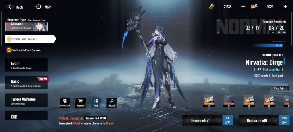The rules of the Crucible Construct Event banner is similar to the usual Arrival Construct Banner in that players are guaranteed to get Nirvatia: Dirge upon getting an S Rank Construct from the banner and will be guaranteed an S Rank Construct every 60 pulls on the banner. However, in addition to the usual Arrival Constructs Banner Rules, the Crucible Construct Event Banner provides players with additional rewards upon doing a set amount of pulls during the banner period. The more you pull on the banners, the more Limited R&D Tickets you will be refunded and you can also obtain additional copies of Nirvatia: Dirge’s signature Weapon and CUB upon reaching certain pull milestones.