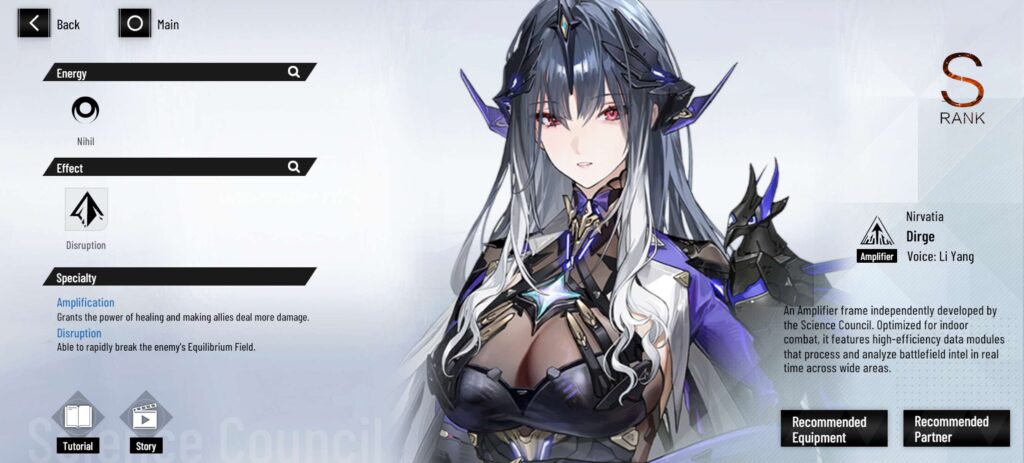 Nirvatia: Dirge is a S Rank Construct of the Nihil Element and Amplifier and is the last piece of the Nihil Elemental team, specializes in buffing and healing the entire team while also dealing amazing Nihil damage to enemies when she is on the field.