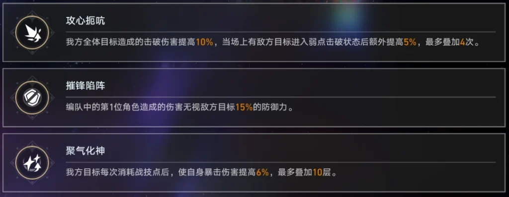 上半的3個增益,其中BUFF1:攻心扼吭適合擊破隊,BUFF2:摧鋒陷陣適合白厄隊,BUFF3;聚氣化神適合消耗戰技點的隊伍。