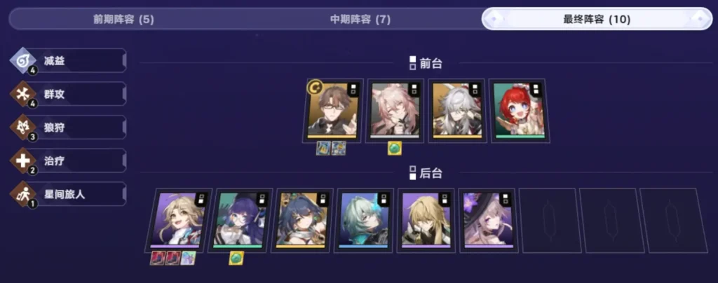 然後速9找瓦爾特。有一個星徽就可以養到6級。升級到6級狼之祖以後,下掉多餘的狼狩羈絆角色,保留3狼狩即可,換上3群攻4減益,就能輕鬆擊穿4星遭遇。第二位面遭遇關建議少養一關,直接湊四減益打遭遇三及以上。