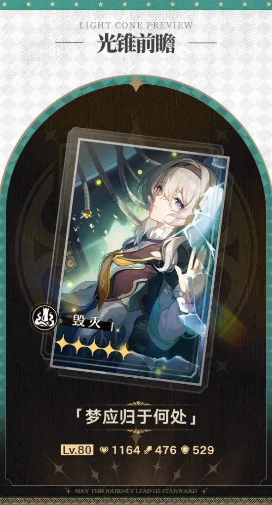 「夢應歸於何處」:這個光錐提供了擊破特攻、擊破易傷、減速三個增益。都是貼合流螢輸出機制的屬性,增益可觀。易傷是比較稀有的乘區,減速效果還能增加流螢和整個隊伍的輸出窗口,讓敵人被擊破後不要那麼快起身。但這些都是數值增益,並沒有不可以替代的機制型增益,所以整體來說這個光錐不會變成剛需,未來是有概率被更好的數值光錐替代的可能性的。而當下如果能夠接受數值降低的話,以下的各種下位光錐也可以考慮。把預算拿去抽有機制提升的星魂。