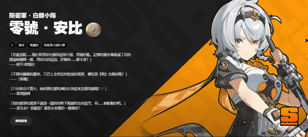 安比是電屬性持續型強攻主C,核心機制圍繞「銀星標記」觸發追加攻擊,輸出平滑無明顯真空期,操作簡單適配「懶人玩家」,兼具無敵幀與追擊能力,高壓高難副本(如深淵)表現穩定,零命機制完整即可發力。