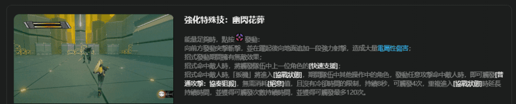 • 協戰狀態:釋放強化特殊技或終結技後進入協戰狀態,持續20秒內隊友攻擊可無冷卻觸發追加攻擊,最多疊加10次,大幅提升輸出與失衡積累效率。