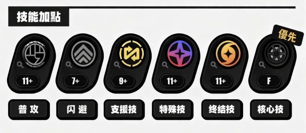 • 關鍵說明:核心技提升全隊加攻幅度,強化特殊技延長染色與增傷持續時間,終結技補充全隊回能,三者優先拉滿;普攻提升異常積蓄效率,支援技與閃避點基礎等級即可。