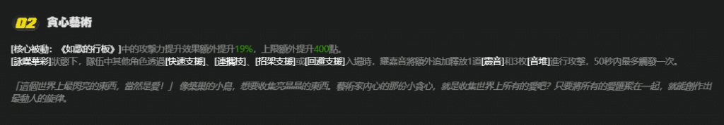 • 核心機制:透過特殊技開啟【詠嘆華彩】狀態,自身無敵駐場,全隊獲得20%增傷+25%暴傷,隊友入場時觸發「震音」追加傷害並疊加攻擊力(最高1200點);終結技能瞬抬全隊血量,還能將兩次快速支援轉化為連攜技,兼顧生存與爆發。