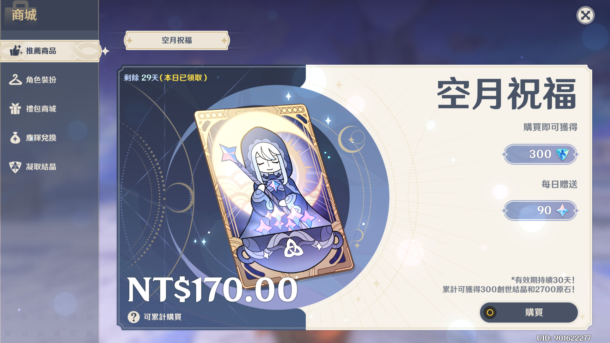 我是可妮的觀眾,領到了免費的小月卡~就算是一條龍也很便宜,儲值快速,也可以在輸入UID時看到角色名確認不會儲錯,很放心!