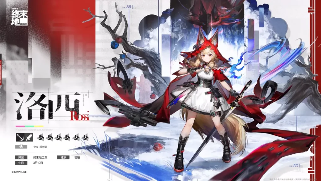 洛茜會以物理單手劍角色的身份登場,職業為近衛。洛西是一位同時具備施加破防與提供單體輸出能力的幹員。她的獨特之處在於,能夠產生法術和物理的混合傷害效果,也是當前唯一能把敵人身上的法術附著轉化成破防效果的幹員,而終結技正是她輸出的最佳時機。