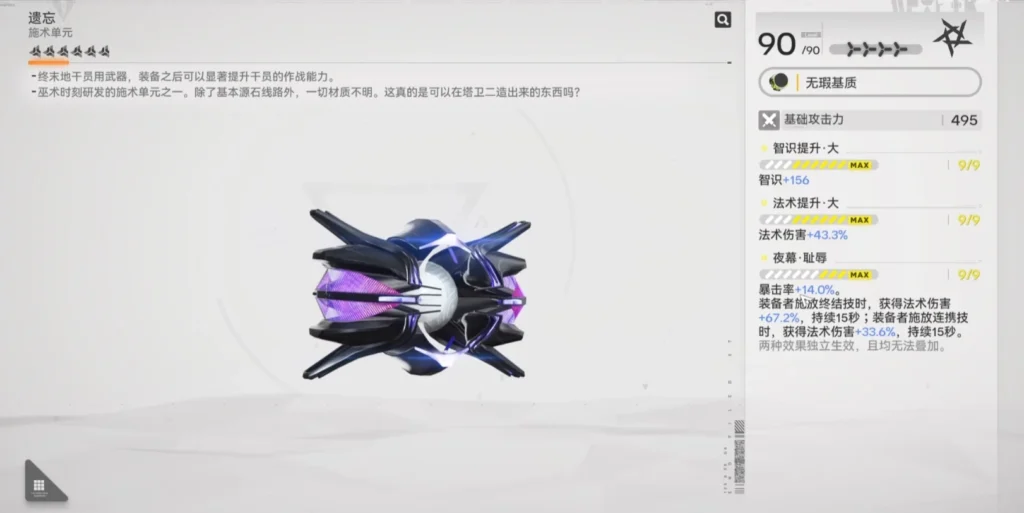 首先來看【遺忘】這把武器,個人覺得強度還是挺高的,智識加156、法術傷害加43.3%、有14%的暴擊率。而且作為一個法師的專武,能夠增加大量的法術傷害,本身也是非常不錯的。但並不是很推薦大家去獲取遺忘。原因也很簡單,目前版本需要施術單元的輸出角色不多,你就算拿了,也就是給佩麗卡用。如果你喜歡玩佩麗卡的話,你可以去獲取遺忘。那輔助這邊大家就更不用擔心了,畢竟我們所有人都會拿到【滄溟星夢】。