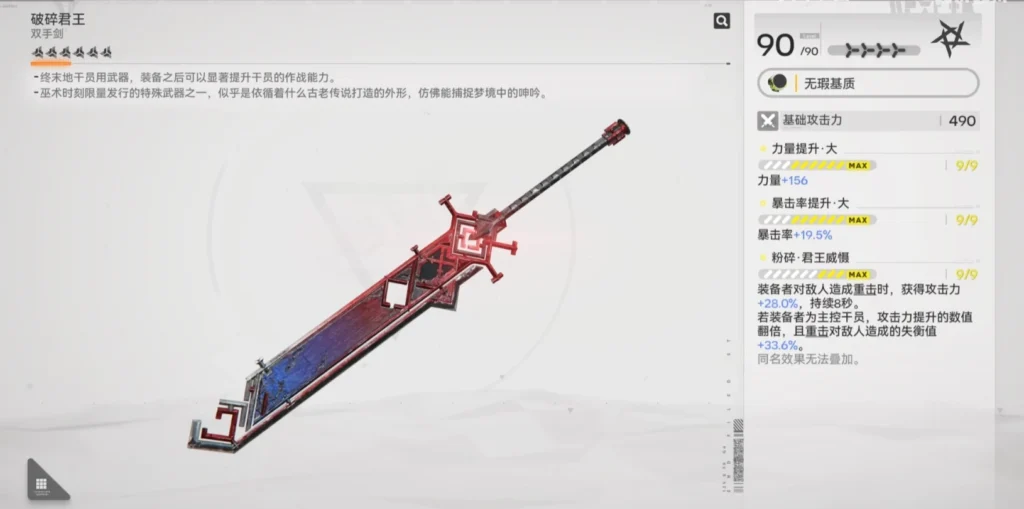 至於輸出比較高的雙手劍,那就是【破碎君王】了。力量主屬性加20%的暴擊率。每當你用普通攻擊的最後一下攻擊打中敵人,你就會獲得28%的攻擊力加成。如果使用這把武器的是你的主控幹員,那就是加56%的攻擊力。那當然攻擊力的含金量的不如屬性傷害,但56%也確實不是一個小的數值。而且這還沒完,普攻的最後一擊能打出更多的失衡值,而普攻的最後一擊本來就是失衡值最多的那一擊。