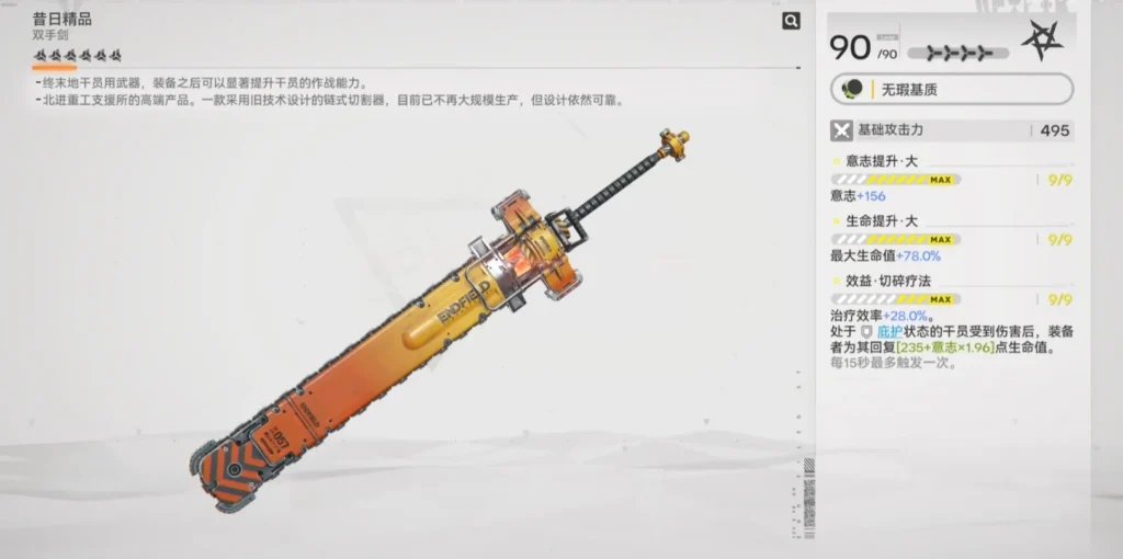 至於【昔日精品】,這把武器是給盾系輔助角色使用的雙手劍,效果提升有限。晝雪有更容易獲得的【終點之聲】,餘燼的話則有專屬武器【大雷斑】,為輔助位置投入這個珍貴資源換取武器,收益極低,我覺得沒有什麼必要。
