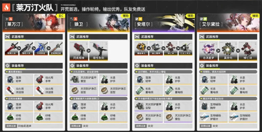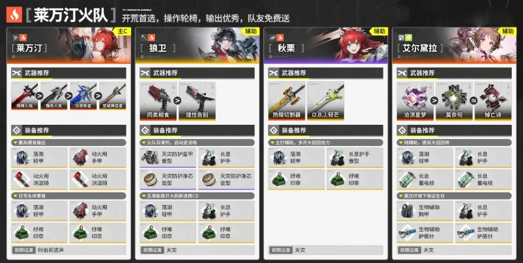 萊萬汀是終末地公測版本的t0級火隊大c,主要靠開大後的強化普攻輸出,強化戰技,還能額外獲取大招能量,整體對單對群皆可,輸出強力。最重要的是配對操作也非常輪椅,不太需要擔心亂軸,甚至可以哪里亮了點哪里。她對隊友的要求雖然比較苛刻,但架不住她的隊友幾乎全白送,服務這塊還是太到位了。目前版本對單可以與四星安塔爾、主線送的五星狼衛,以及簽到三天就送的艾爾黛拉組隊。這群可以把安塔爾換成四星先鋒秋栗,效果也相當不俗。在我們細細品味萊萬汀美背時,還可以看到招牌嫌棄臉回來了,都回來啦,祖母再帶我們沖一次吧!