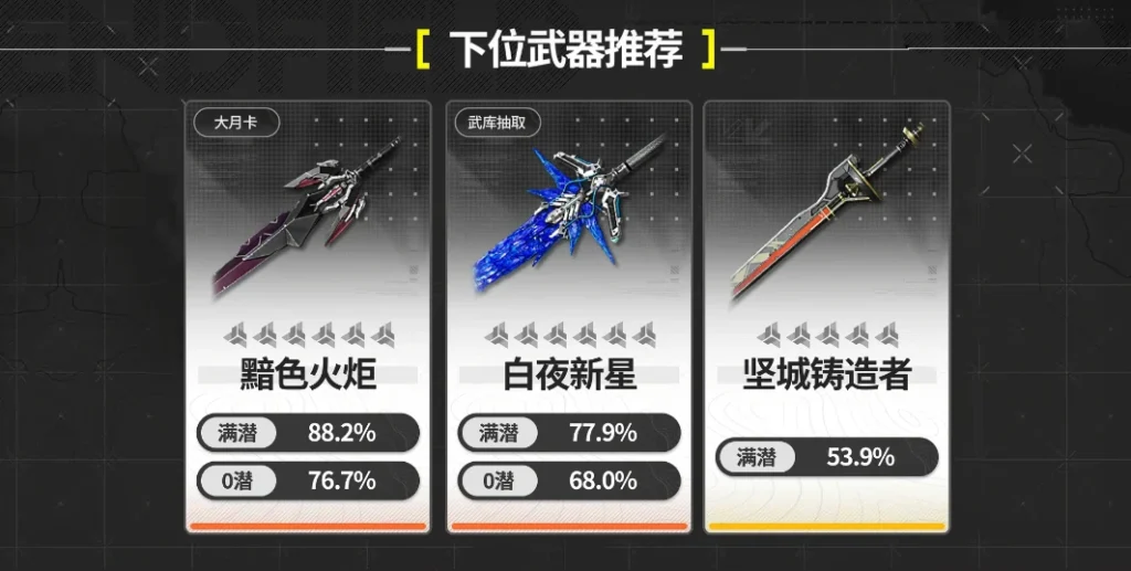 - 【黯色火炬】:大月卡武器,它的效果是場上沒有一個敵人被施加燃燒或腐蝕狀態,裝備者造成的灼燒傷害提升22.4%,最多疊兩層。這個buff疊滿的情況下,提供的灼熱傷害加成還是不錯的。