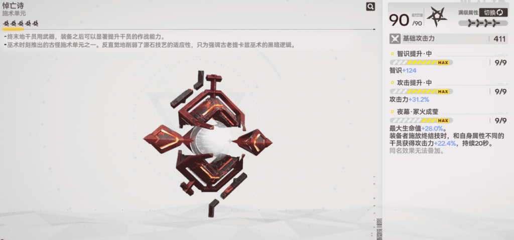 若沒有上述兩把武器,輔助向的「悼亡詩」亦可攜帶:釋放大招後,非自然屬性隊友可獲得22.4%攻擊力加成。由於現版本主控幹員多非自然屬性,此加成輕鬆就能吃滿數值。