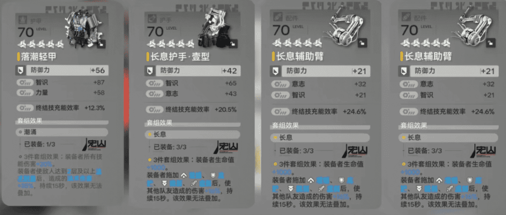 推薦裝備組合:長息護手·壹型+長息輔助臂×2+落潮輕甲,此配置能有效加快終結技充能效率,並讓開啟終結技後的增傷效果更穩定。