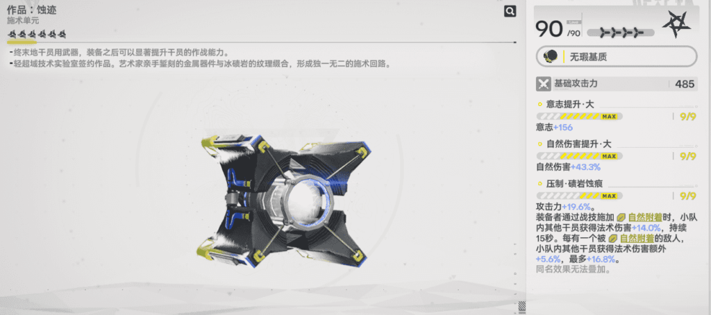 次選大月卡武器「作品·蝕跡」:潔爾佩塔釋放戰技後,全隊獲得14%法術傷害加成,每多一名敵人額外提升法術傷害,最高可疊至16.8%。作為專武的最佳平替,其優勢在於獲取穩定,無需抽取。
