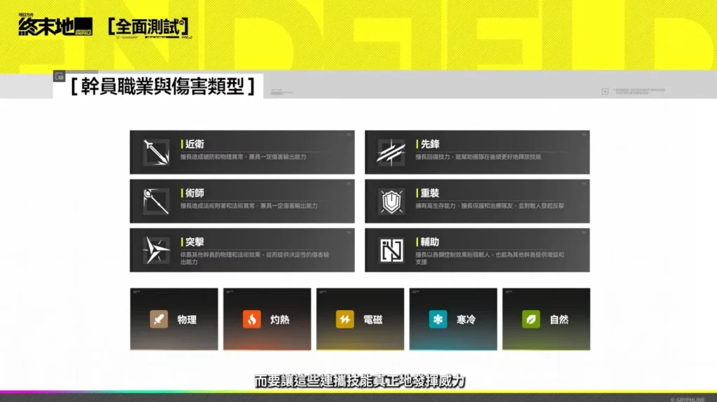 現階段戰鬥職業有 近衛 / 術師 / 先鋒 / 突擊 / 重裝 / 輔助,這六種職業分工明確、節奏不同:前排(近衛 / 突擊)憑藉連段和失衡來打點開窗;術師 運用法術串聯反應;先鋒負責打理資源和轉場;重裝依靠嘲諷與減傷穩定場面;輔助通過治療、Buff 和控場來銜接輪轉。