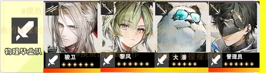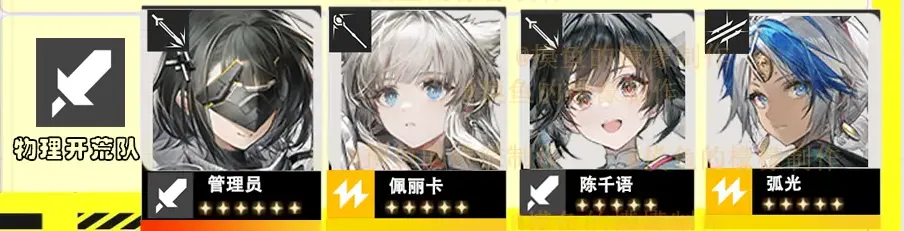 配對初步圍繞禦三家角色構建,禦三家偏物理輸出,以管理員和陳千羽為核心,打破防擊飛並利用管理員原始控制。後續轉型可依四星、五星角色選擇。若提升隊伍物理輸出,可換大潘,其物理輸出倍率高、傷害足;若對輸出要求不高,可上五星弧光,與佩麗卡連攜觸發弧光被動回復技力,讓管理員或陳千羽更快獲技力補給;若操作不夠自信,可上生存輔助類角色如盾輔晝雪,或治療輔助角色如賽希。四號位較自由,開荒初步隊伍圍繞物理體系,後續可向物理電、物理冰轉型。