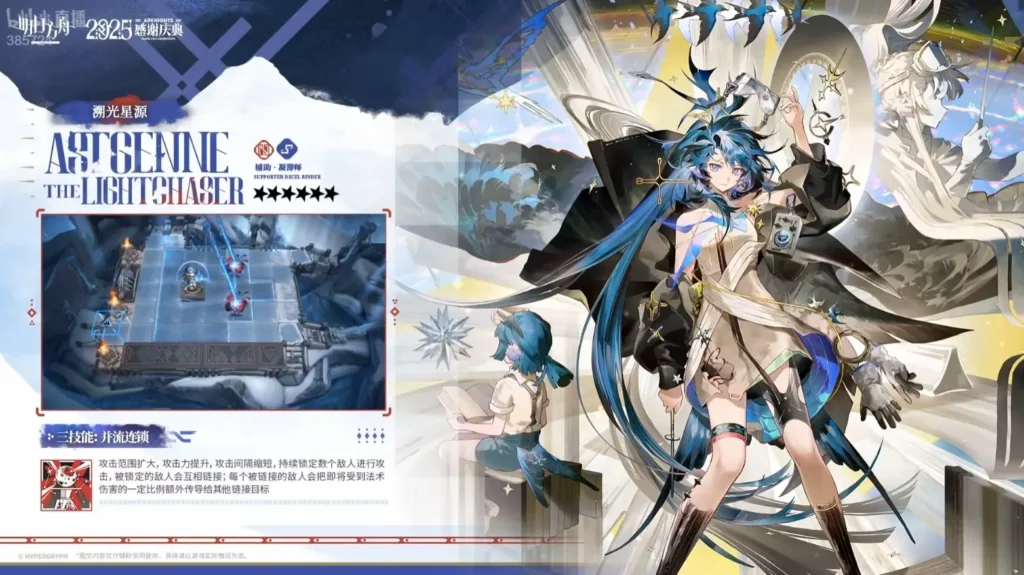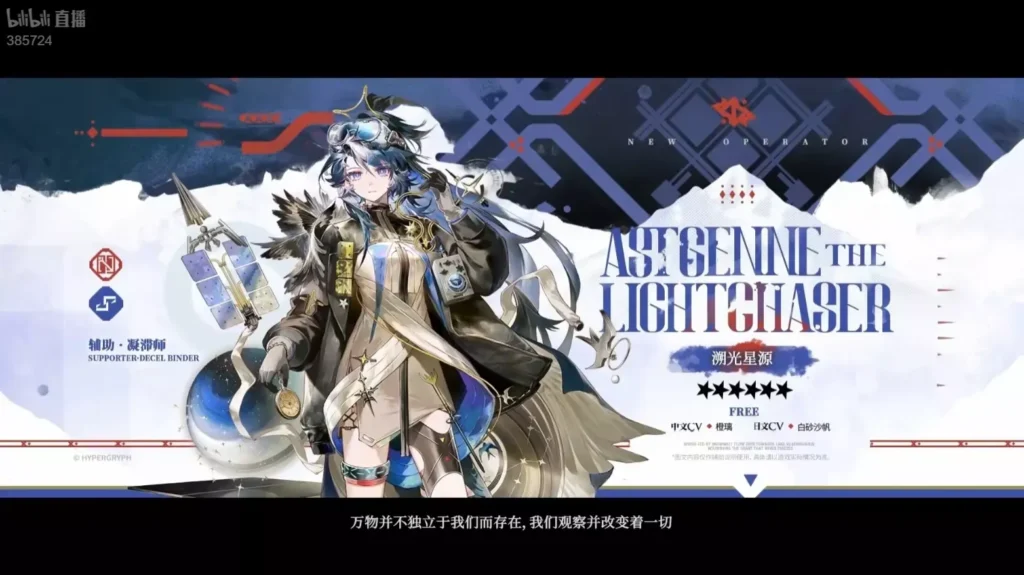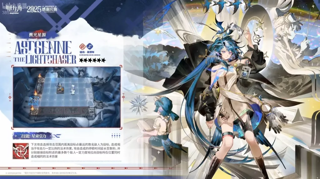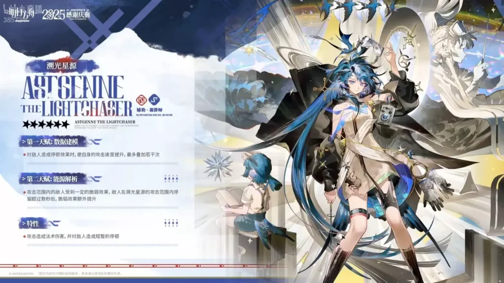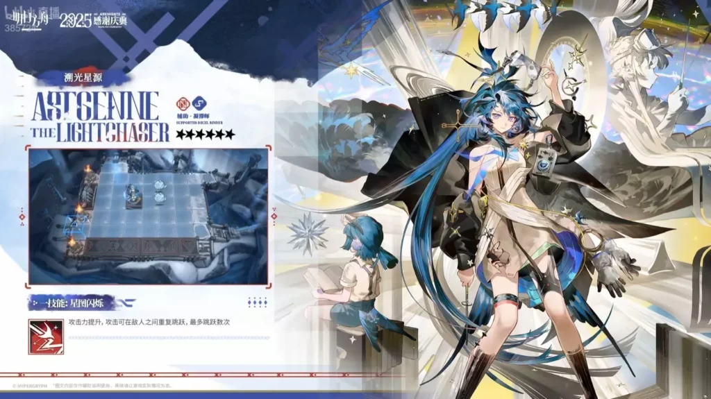 作為贈送6星,溯光星源定位輔助,職業凝滯師。立繪充滿航太科技感,藍色的發絲搭配未來感十足的服飾,背後的觀測設備呼應了“溯光”的主題,技能定位偏向控制輔助,對於新手玩家和收藏黨來說都是必拿的福利,而且只需通過簽到就能獲取,玩家直呼“官方這次誠意線上”。