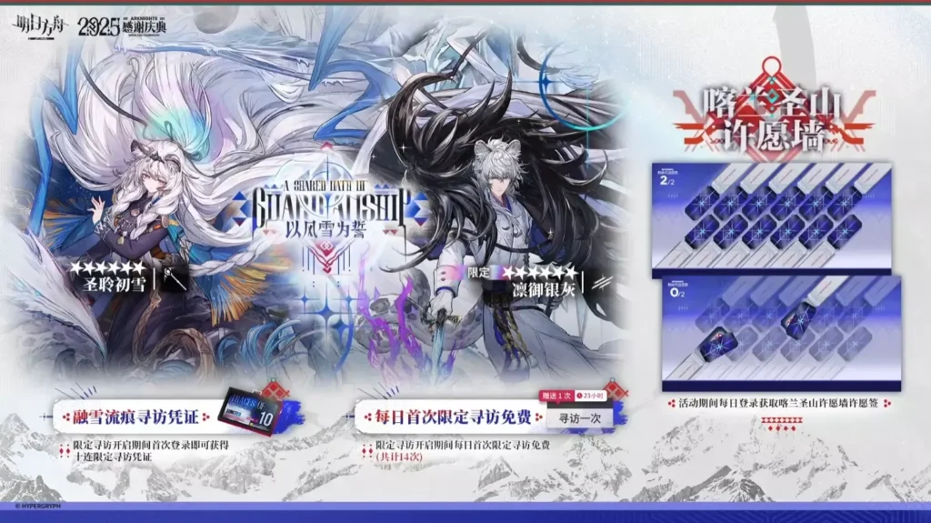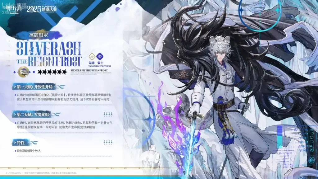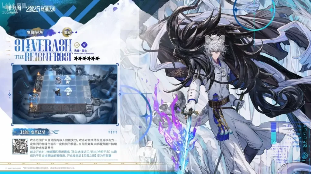 在此次半周年直播中,最引人注目的消息無疑是銀灰與初雪的異格形象同時亮相。銀灰的異格形象被命名為“凜禦銀灰”,他摒棄了部分商業領袖的氣質,以先鋒·策士的身份重新出現。他的立繪身著裝飾有白色毛髮的雪境戰甲,肩上是展翅的黑鷹,目光如冰峰般銳利,完美展現了謝拉格領袖的威嚴與霸氣;