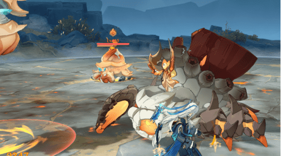 2. 新增召喚物機制:BOSS 會召喚「堅盾重甲蟹」,此小怪擁有 12 單位的火元素護盾;當小怪的火盾耗盡後,它會失控撞向 BOSS,使 BOSS 損失 12 單位的火元素護盾,此為破雙角的重要操作。