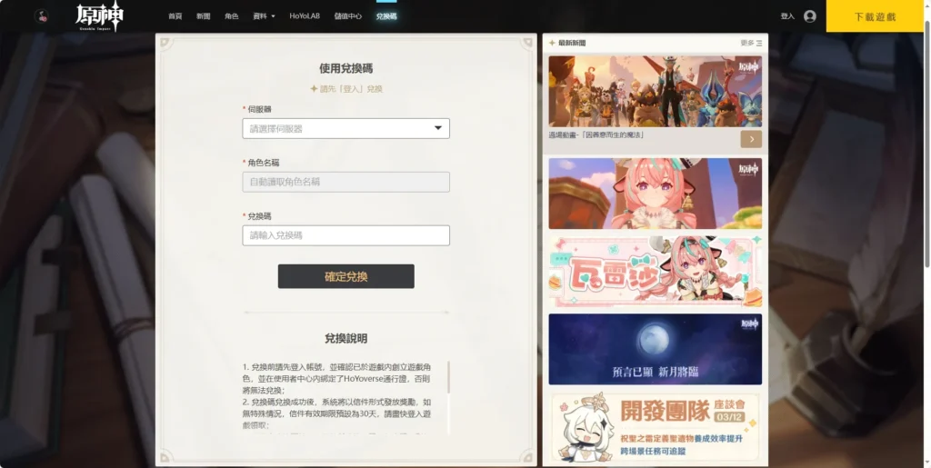 - 前往原神官方兌換碼專用頁面