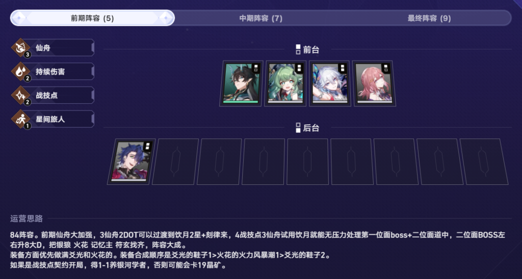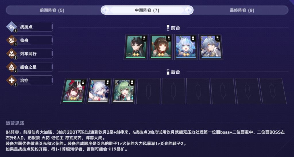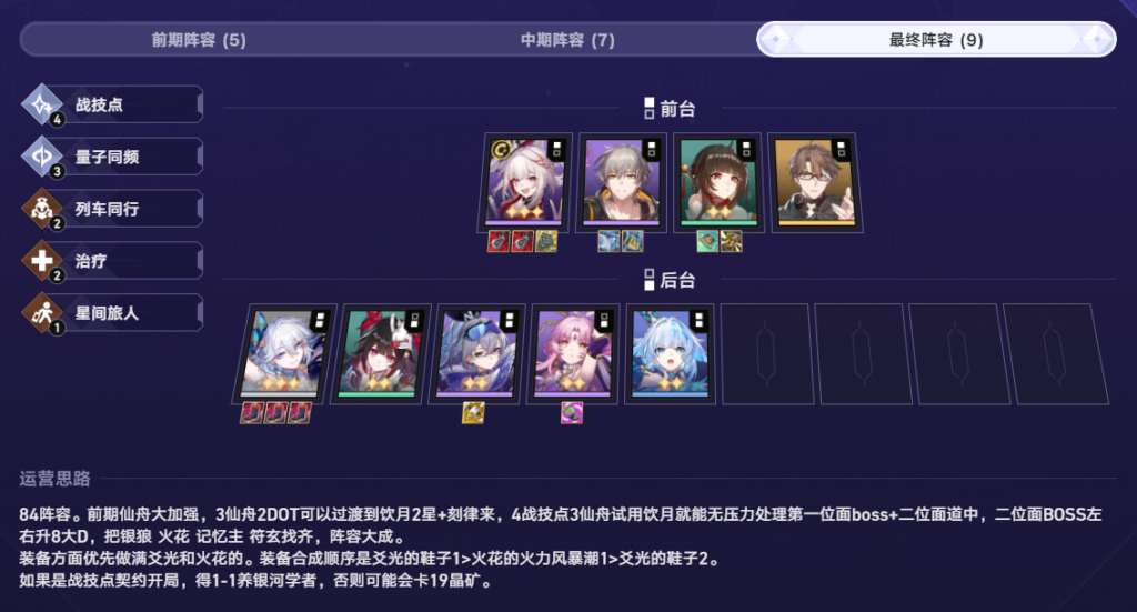 陣容上,火花的配隊羈絆思路幾乎跟飲月沒有區別。6戰技點是不提升大獎概率的,帶2個掛件,開6戰技點基本上是負提升。最優解是帶銀狼、符玄,湊3量子提升最明顯。至於8戰技點成型難度非常之高,需要開局凹青雀專家,並且局內拿到包括紅A在內的6個不同費用角色。且還需要要兩個轉職才行,基本不考慮。
