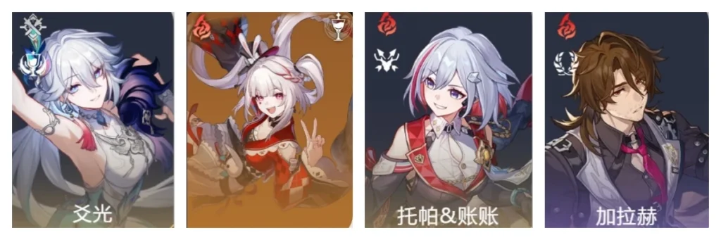 爻光作為輔助核心,歡愉度增益;花火戰技點平衡+暴擊加成;托帕作為副C,追加攻擊快速疊滿爻光天賦層數;加拉赫治療+削韌。