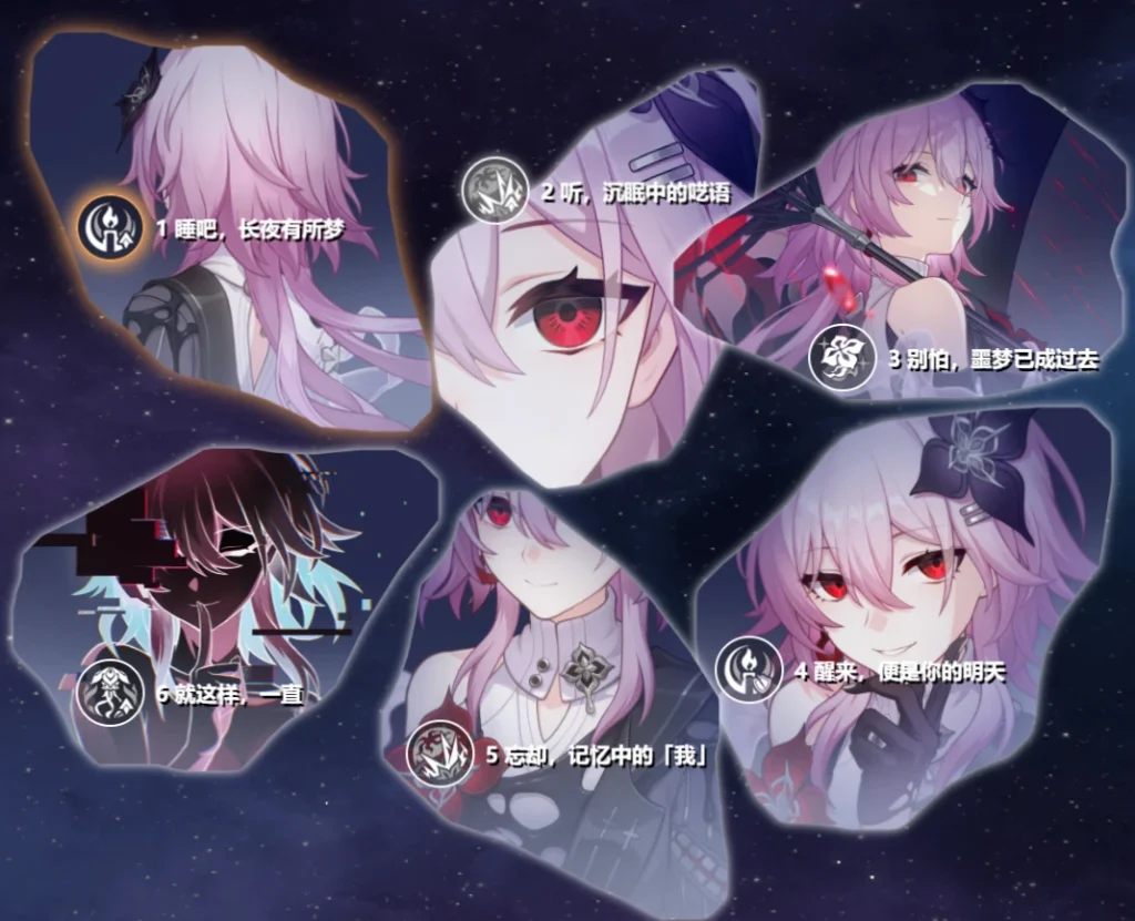 | 聽,沉眠中的囈語 | 長夜月和憶靈「長夜」的暴擊傷害提高40%,每當長夜月獲得【憶質】時,使獲得的【憶質】數量提高2點。施放終結技時,額外獲得2點【至暗之謎】的充能。 |