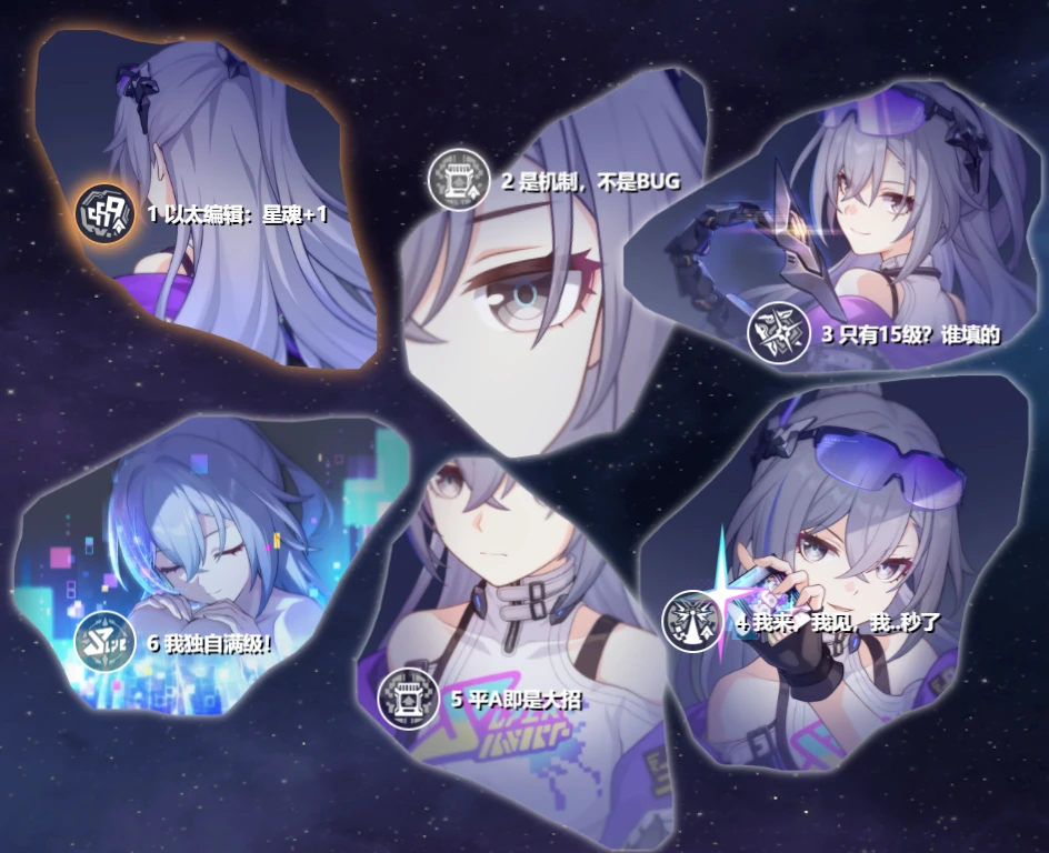 「歡迎來到銀河城」:使裝備者的速度提高18%,且造成的「歡愉」傷害無視目標20%的防禦力。當裝備者對自身施放終結技時,獲得20點「笑點」。此效果最多可觸發1次,並會在施放3次基礎攻擊力後重置。