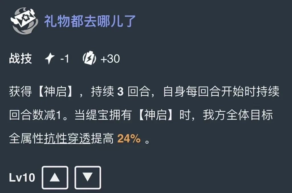 - 群體輔助天花板:戰技提供24%全屬性抗性穿透(持續3回合),終結技展開結界賦予敵方30%易傷(持續2回合),覆蓋所有傷害類型,且乘區稀缺不易稀釋。
