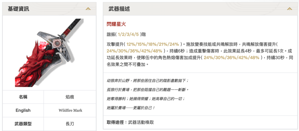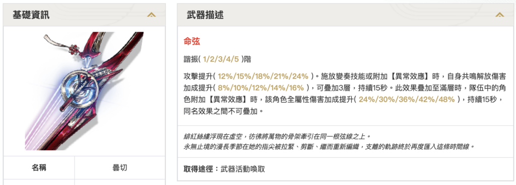 - 施放變奏技能或共鳴解放時,共鳴解放傷害提升(24%/30%/36%/42%/48%),持續6秒;造成重擊傷害時,效果延長4秒(最多疊加1次)。
