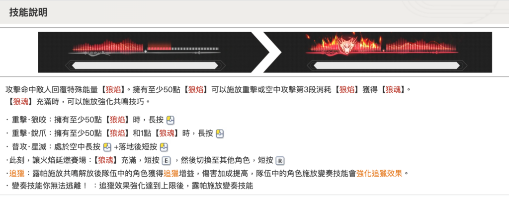 - 【狼焰】:血條上方上限100點的特殊能量條(如下圖左所示)。可透過常態攻擊命中、共鳴技能施放期間、共鳴解放施放期間回復。