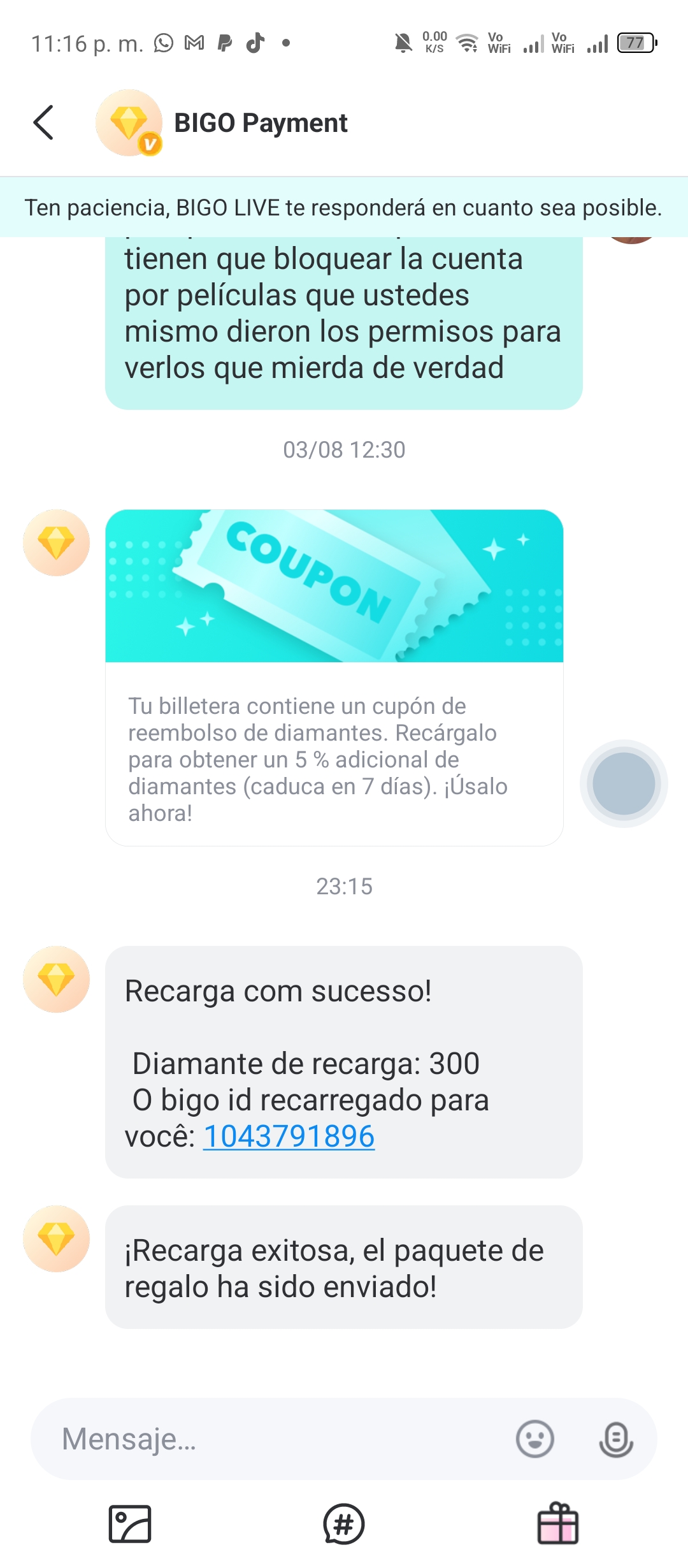 - Pay & Receive – Use PayPal, card, or local wallet; Diamonds hit your wallet within 3 minutes (usually seconds). You can check your balance through: App > "Me" > Wallet. If there is a wrong ID, the support feature fixes it free within 24 hours.